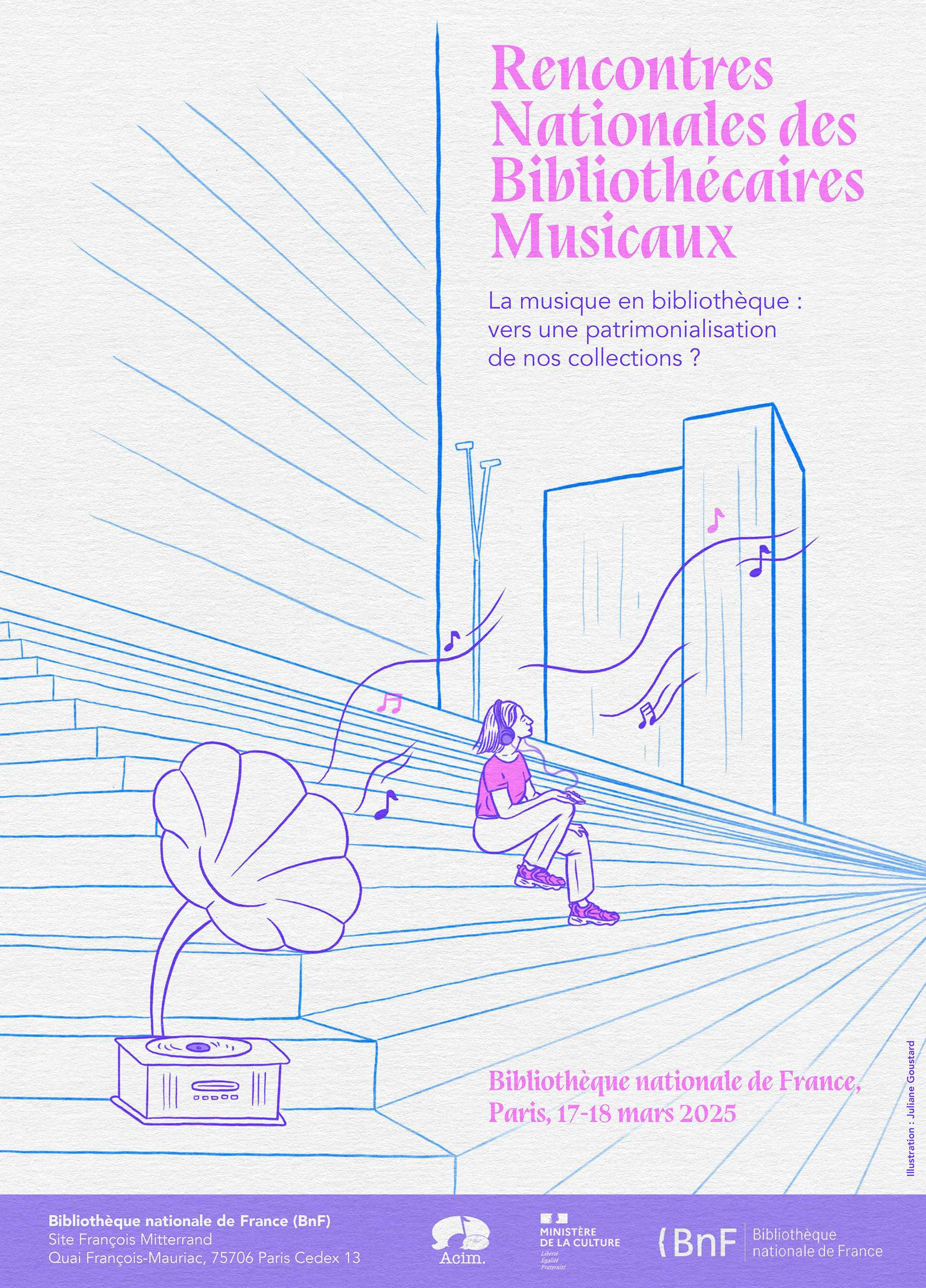 Illustration et mise en page de l'affiche des Rencontres Nationales des Bibliothécaires Musicaux 2025, organisées par l'ACIM, à la Bibliothèque nationale de France.